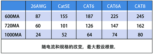 由表可以看出,同一規(guī)格下,電流增大,在安全條件下,最大敷設(shè)根數(shù)減小;電流恒定時(shí),網(wǎng)線類別越高,最大敷設(shè)根數(shù)越大。