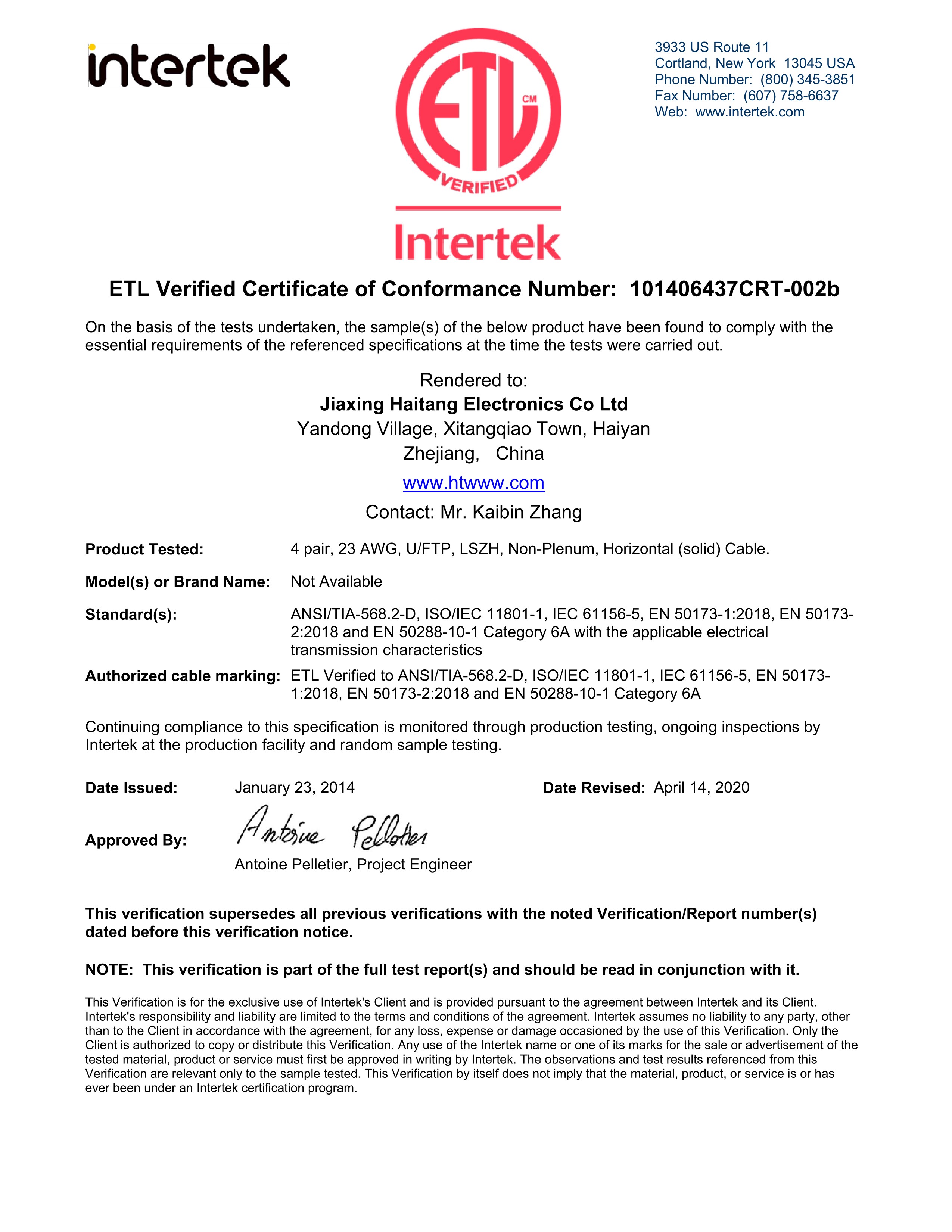UFTP CAT6A 23AWG LSZH ETL性能認(rèn)證